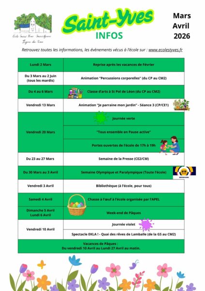 - Classe d’arts à St Pol de Léon (CP au CM2) : Du 4 au 6 Mars 2026