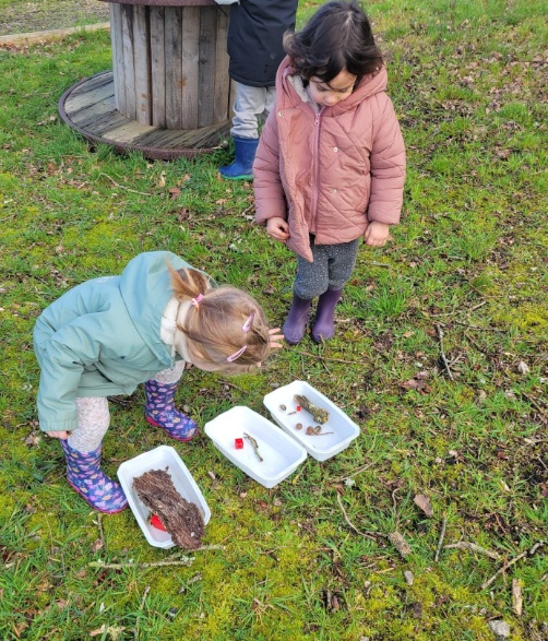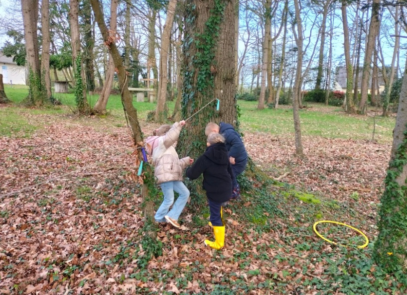Au programme : recherche d’indices de la présence d’animaux dans le bois, parcours de motricité, former des lettres, Land Art, les grandeurs (petit, moyen, grand)…