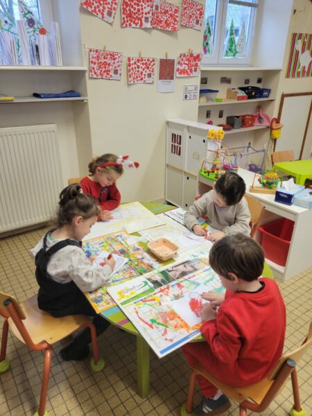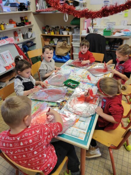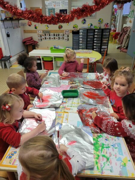 En maternelle, Nous avons lu l’album “le noël du hérisson” puis nous avons utilisé une nouvelle technique pour réaliser un fond : mettre du feutre sur du papier aluminium, vaporiser de l’eau puis poser une feuille blanche et apprécier le résultat.